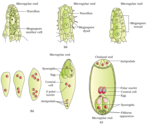 and the formation of the 4-nucleate and later the 8-nucleate stages of the embryo sac. After the 8-nucleate stage, cell walls are laid down leading to the organization of the typical female gametophyte or embryo sac.