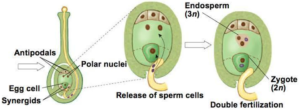 After entering the one of the synergids, each pollen grain releases two male gametes. One male gametes fuse with egg (Syngamy) and other male gametes fuse with two polar nuclei (triple fusion) to produce triploid primary endosperm nucleus (PEN). Since two types of fusion takes place in an embryo sac the phenomenon is called double fertilization. The PEN develops into the endosperm and zygote develops into embryo.