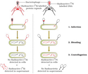 The viral coats were removed from the bacteria by agitating them in a blender. The virus particles were separated from the bacteria by spinning them in a centrifuge. Bacteria which was infected with viruses that had radioactive DNA indicating that DNA was the material that passed from the virus to the bacteria.