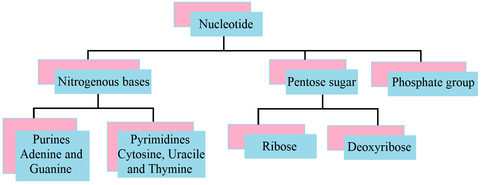 A nucleotide has three components – a nitrogenous base, a pentose sugar (ribose in case of RNA, and deoxyribose for DNA), and a phosphate group. There are two types of nitrogenous bases – Purines (Adenine and Guanine), and Pyrimidines (Cytosine, Uracil and Thymine).