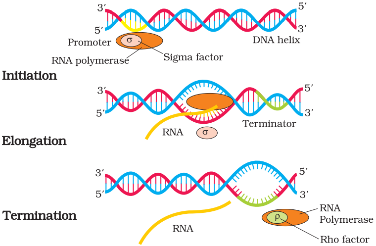 In this step rho, a terminator factor replaces the initiation factor at the DNA sequence termination point. At this stage RNA and RNA polymerase, an enzyme is separated with rho factor.