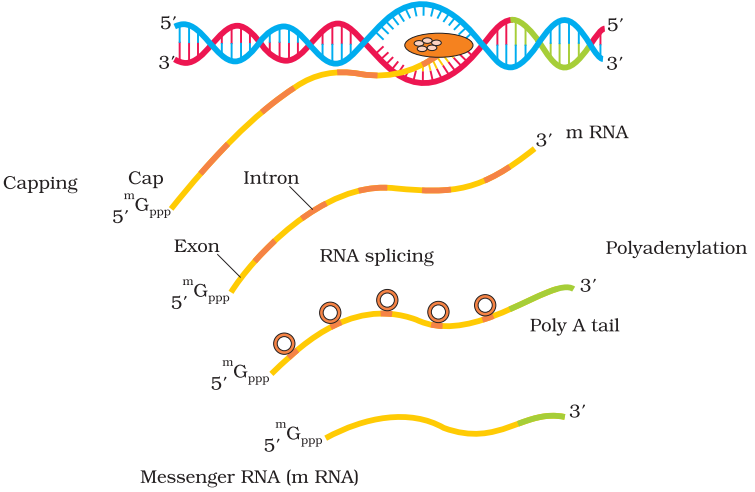 In tailing, adenylate residues (200-300) are added at 3′-end in a template independent manner. It is the fully processed hnRNA, now called mRNA, that is transported out of the nucleus for translation.