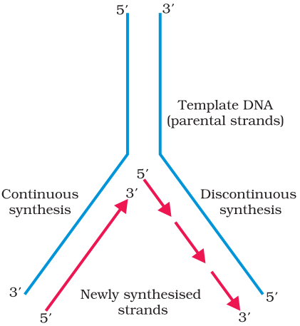 The DNA-dependent DNA polymerases catalyse polymerisation only in one direction, that is 5′ → 3′. on one strand (the template with polarity 3′ → 5′), the replication is continuous, while on the other (the template with polarity 5′ → 3′), it is discontinuous.