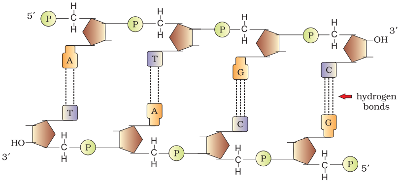 - The bases in two strands are paired through H-bonds. Adenine and Thymine forms double hydrogen bond and Guanine and Cytosine forms triple hydrogen bonds.
