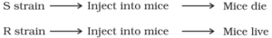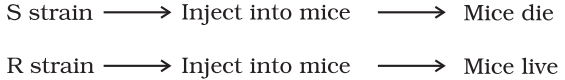 Mice infected with the S strain (virulent) die from pneumonia infection but mice infected with the R strain do not develop pneumonia.