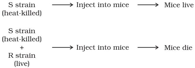 Griffith was able to kill bacteria by heating them. He observed that heat-killed S strain bacteria injected into mice did not kill them. When he injected a mixture of heat-killed S and live R bacteria, the mice died. Moreover, he recovered living S bacteria from the dead mice.